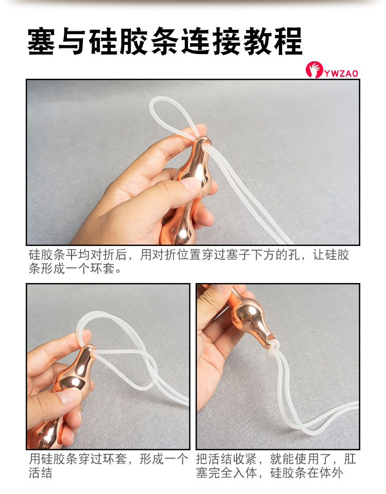 方式1:单独使用肛塞,使用前先用我们配送的硅胶绳已活结的方式连接,连接后肛塞就可以整个插入体内,最后绳子保留在外面。绳子可根据实际情况修剪长度。