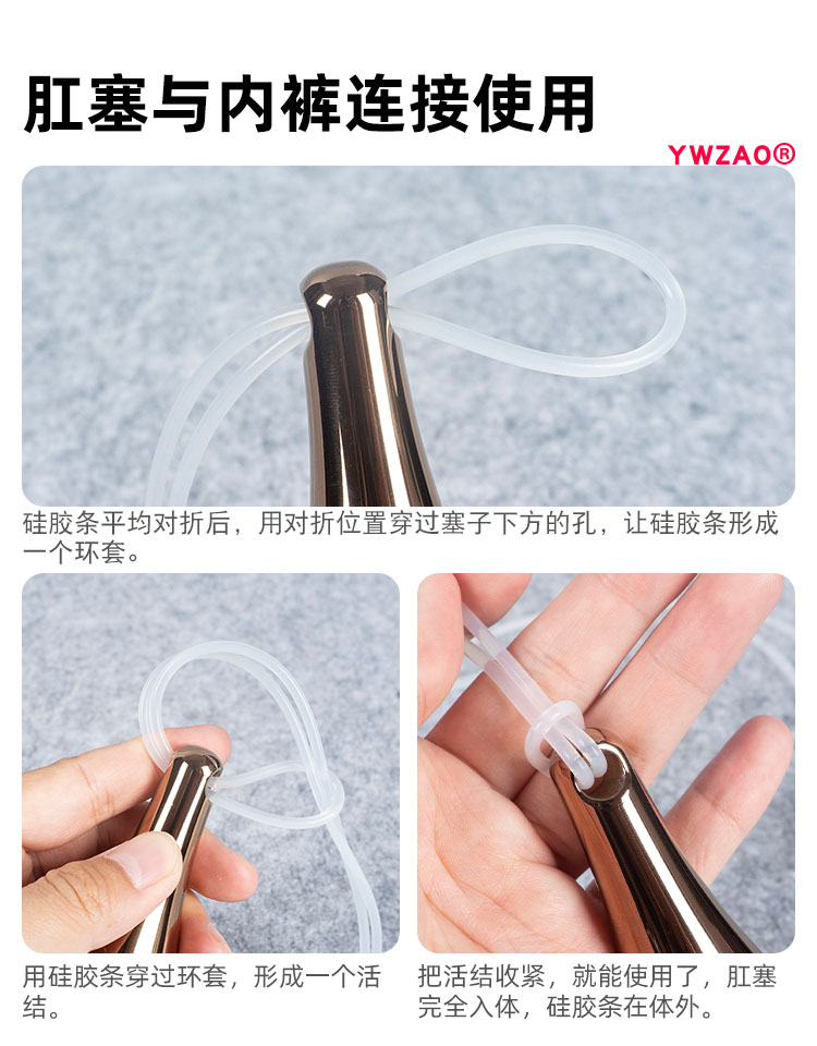 方式1:单独使用肛塞,使用前先用我们配送的硅胶绳已活结的方式连接,连接后肛塞就可以整个插入体内,最后绳子保留在外面。绳子可根据实际情况修剪长度。
