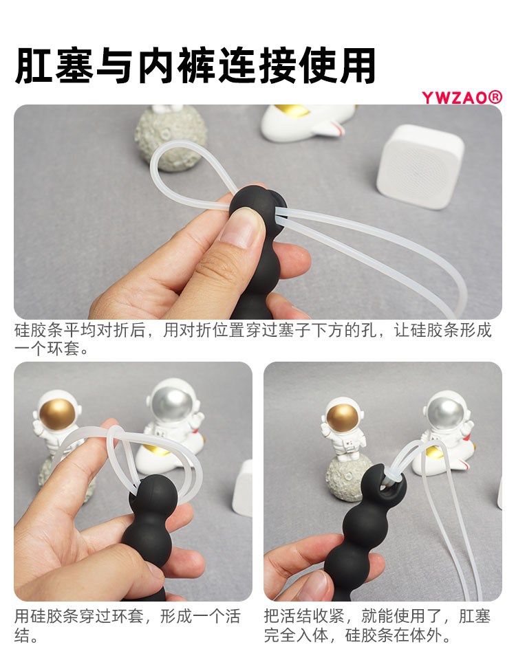 单独使用肛塞,使用前先用我们配送的硅胶绳已活结的方式连接,连接后肛塞就可以整个插入体内,最后绳子保留在外面。绳子可根据实际情况修剪长度。