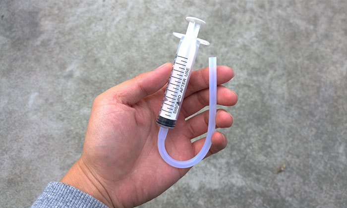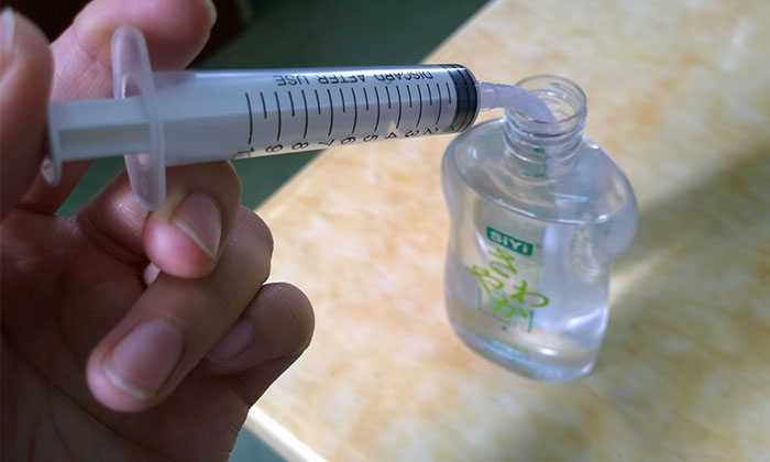 建议各位使用的时候,直接用管子探入瓶子内部,用抽的方式把液体转移到注射器上。千万不要用倒的方式转移润滑剂,因为这样很难把里面的空气打出来。