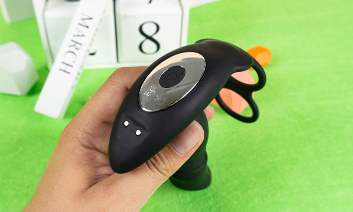 按摩器有两个圆环,外面的圆环套进阴茎,从龟头套入直至阴茎根部。里面的圆环是套在蛋蛋上的,直接套入即可,最后把按摩器插入后庭即完成佩戴。