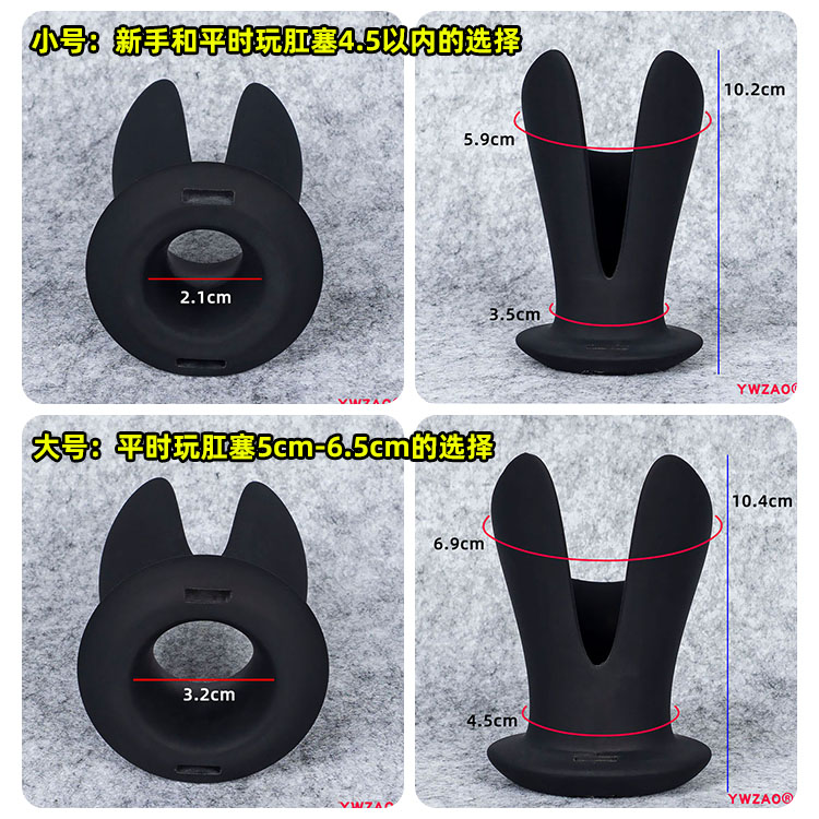这款肛环有小号与大号2个尺寸,以玩实心的硅胶肛塞为基础,新手与开发程度在4.5以内的,选择小号就可以。如果开发程度在4.5cm-6.5cm就选择大号。
