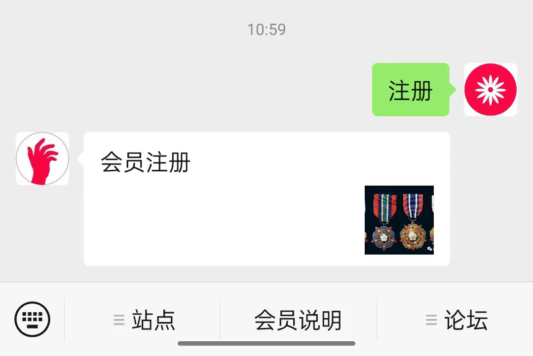 进入公众号,点击下方导航栏最左边按钮,调出对话框。然后在对话框输入:注册