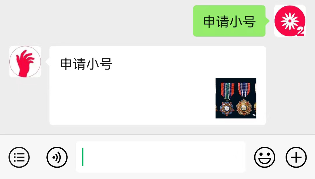 进入公众号,点击下方导航栏最左边按钮,调出对话框。然后在对话框输入:申请小号